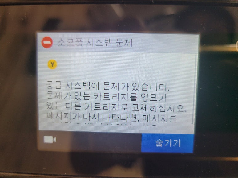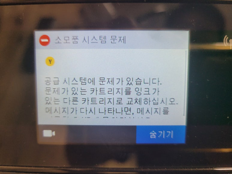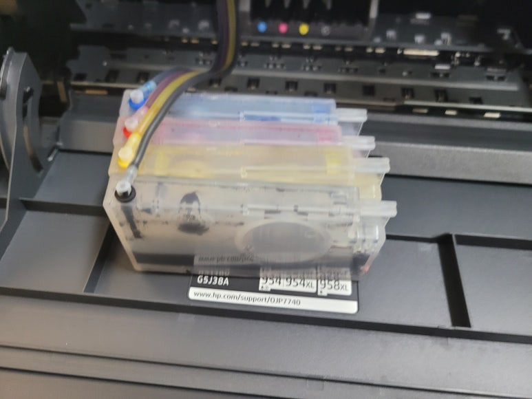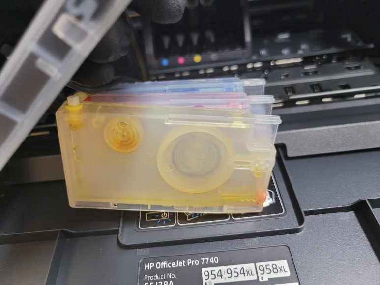 HP OfficeJet Pro 7740 팩스복합기 무한잉크 장치는 소모품 시스템 문제 및 공급 시스템 문제는 전면 커버를 열었다 닫았다 3회 진행하면 카트리지 확인 후 정상 작동됩니다.