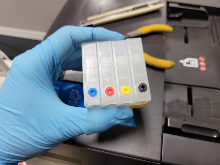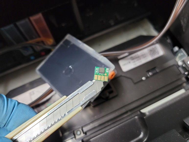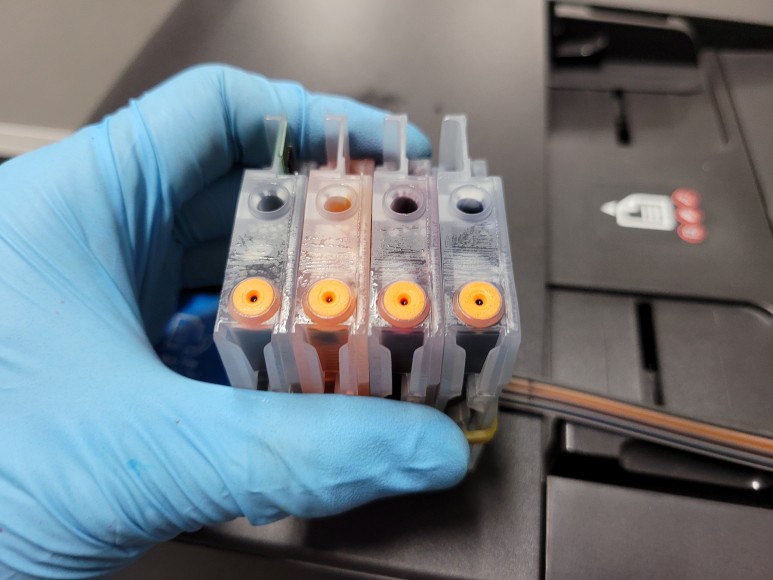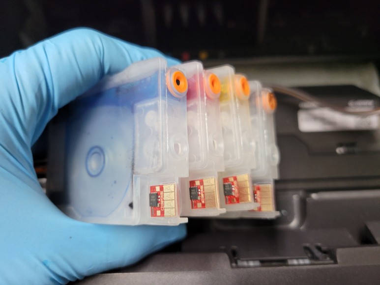 Chipless Solution(No Chip)용 카트리지에 인증칩 1개를 부착했습니다. 잉크 퀵차단밸브를 장착, 결합하고 카트리지 석션하여 호스 및 카트리지 내부에 가득 채웠습니다.