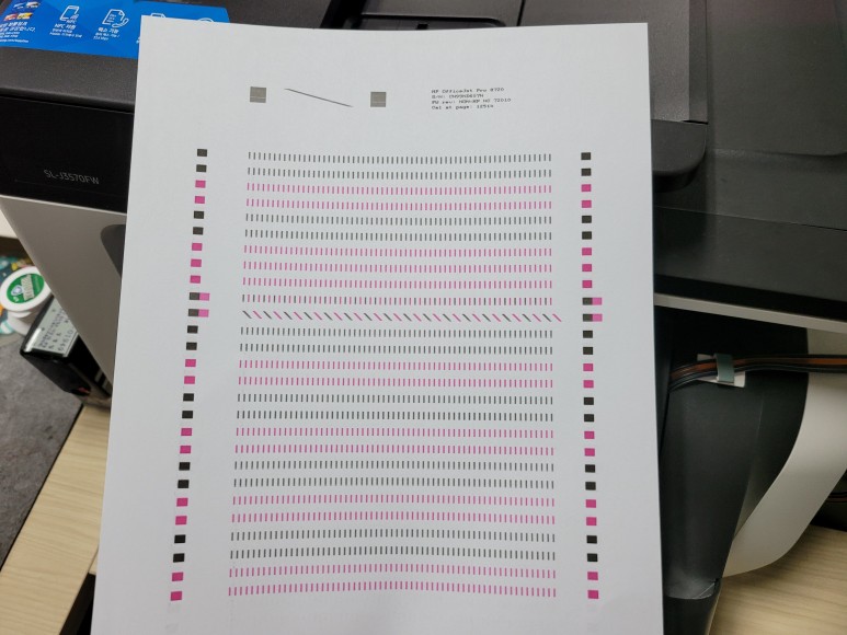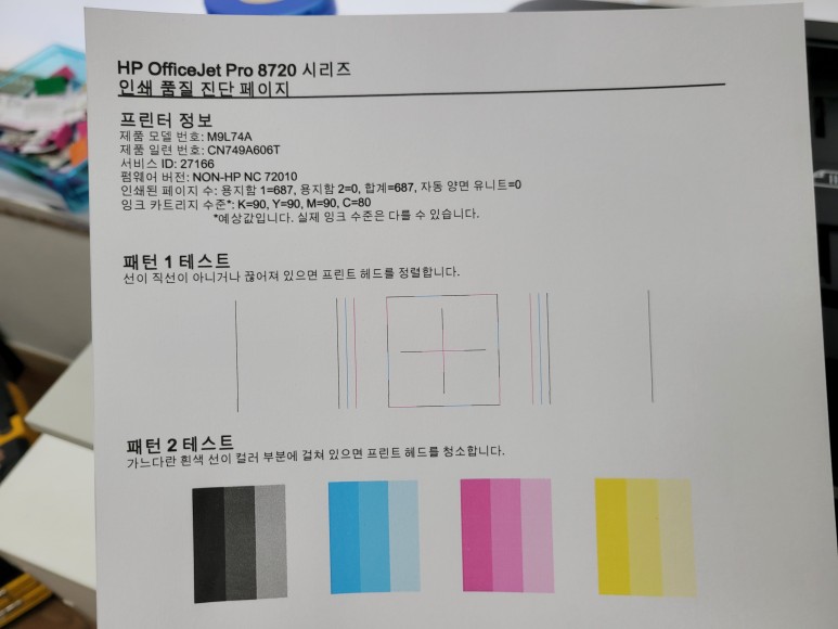 헤드 노즐 점검을 위해 인쇄 품질 진단 페이지를 출력했습니다. 진단페이지에 HP 8720이라고 출력되어 나옵니다.