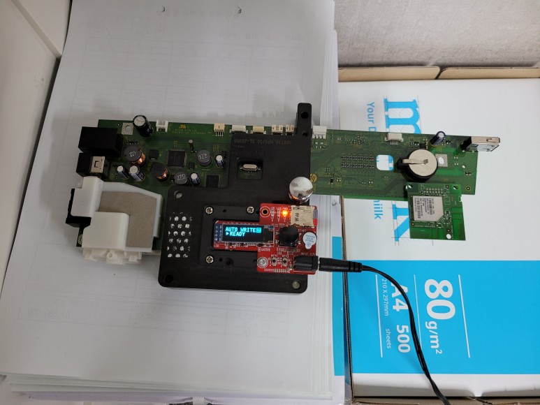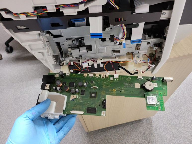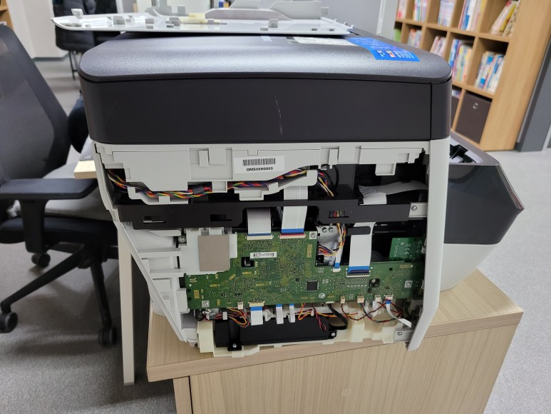 메인보드를 재장착하고 전원을 연결하여 초기화 완료 후에 정상적 헤드 정렬 페이지가 출력되고 Chipless Solution(No Chip) 인증을 위해 초기 부착한 인증칩을 제거했습니다.