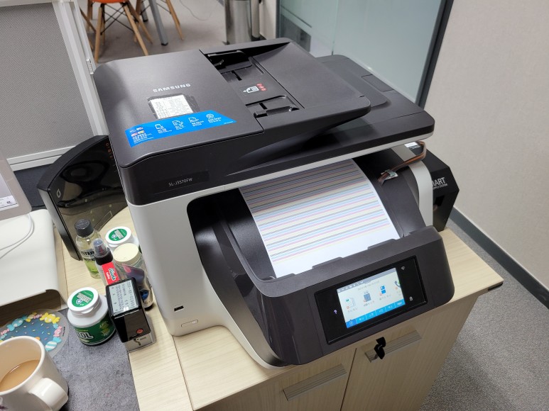 서울 성동구 성수동에 위치한 하우스디세종타워 내 업체 사무실에서 사용하는 삼성 SL-J3570FW 무한잉크 팩스복합기로 잦은 카트리지 문제 및 소모품 시스템 문제로 멈춰버린 유한 4칩 SL-J3570FW 무한잉크 장비를 임대형 및 기업형, B2B용 (보험사, 군부대, 학교, 학원, 부동산, 핸드폰매장, 교육사 등등)으로 사용되는 칩없이 구동하는 기업형 No Chip (Chipless Solution) 무한잉크 장비로 전환 출장수리 요청으로 스케줄 맞춰 방문하여 수리 완료 했습니다.