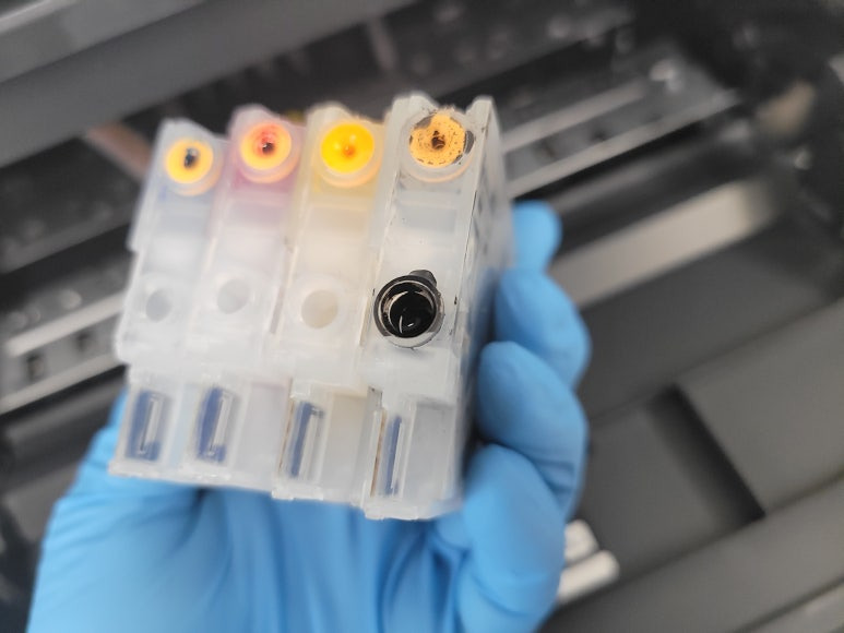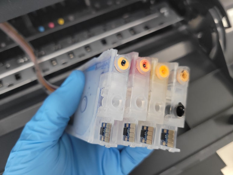 출력불량 및 잉크 카트리지 문제로 빠른 전체 점검 필요 이유 : 1. 호스 내 잉크 경화로 잉크공급 不 2. 카트리지 부싱 및 패킹 노후로 공기유입으로 잉크공급 不 3. 헤드 內 잉크공간 챔버 터짐 (칩판부 슈팅에어라인 비닐탈락, PCB 오염) 4. 스테이션 펌핑모터 불량으로 인한 잉크공급 不