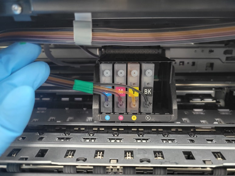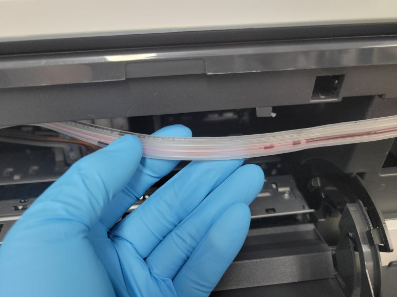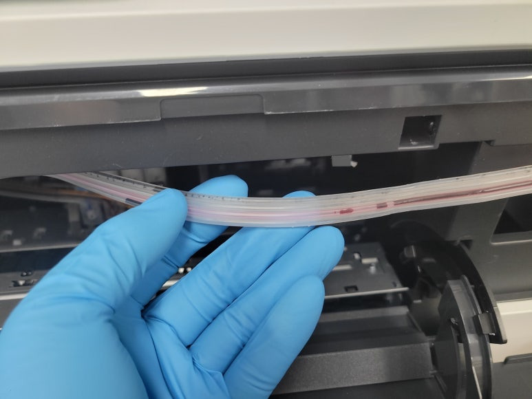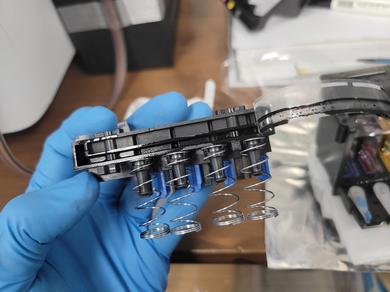 ● 프린터 헤드 클램프 부착 및 핫멜트 보강, 호스 재정리 장착