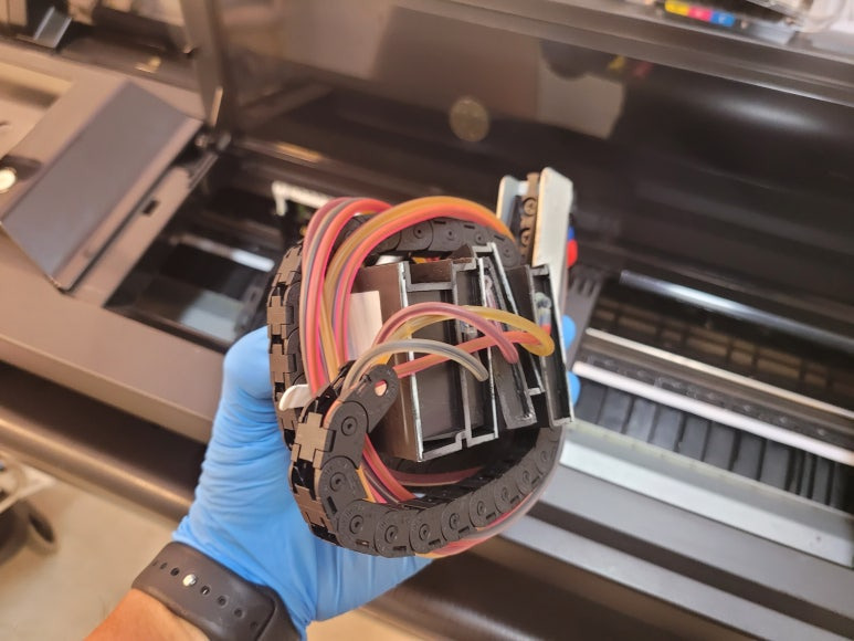 출력불량 및 잉크 카트리지 문제로 빠른 전체 점검 필요 이유 : 1. 호스 내 잉크 경화로 잉크공급 不 2. 카트리지 부싱 및 패킹 노후로 공기유입으로 잉크공급 不 3. 헤드 內 잉크공간 챔버 터짐 (칩판부 슈팅에어라인 비닐탈락, PCB 오염) 4. 스테이션 펌핑모터 불량으로 인한 잉크공급 不