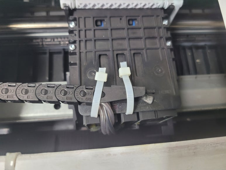 출력불량 및 잉크 카트리지 문제로 빠른 전체 점검 필요 이유 : 1. 호스 내 잉크 경화로 잉크공급 不 2. 카트리지 부싱 및 패킹 노후로 공기유입으로 잉크공급 不 3. 헤드 內 잉크공간 챔버 터짐 (칩판부 슈팅에어라인 비닐탈락, PCB 오염) 4. 스테이션 펌핑모터 불량으로 인한 잉크공급 不