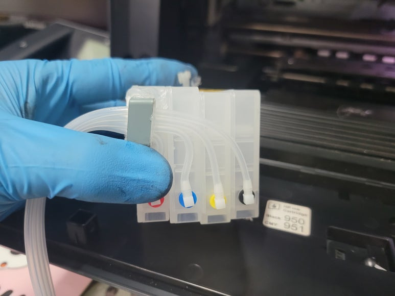● 프린터 헤드 클램프 부착 및 핫멜트 보강, 호스 재정리 장착