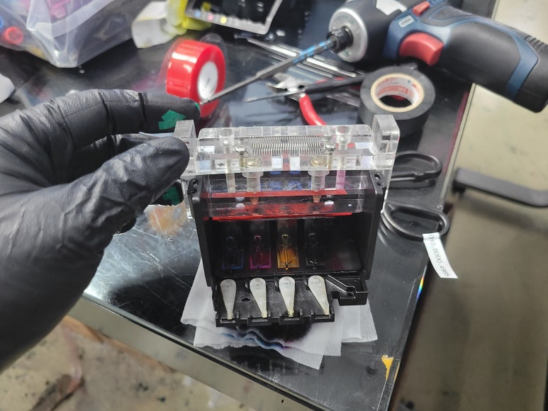 ● 프린터 헤드 클램프 부착 및 핫멜트 보강, 호스 재정리 장착