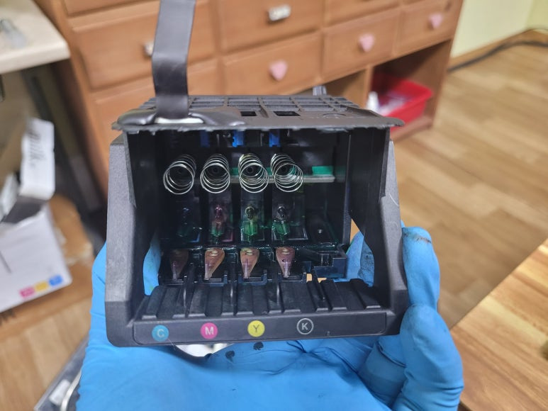 3) 미세한 노즐 막힘은 헤드 챔버 부분을 터지게 합니다. 사람도 뇌혈관이 막히면 터져 사망에 이르게 됩니다. 헤드도 노즐이 막히면 헤드가 터져 잉크가 흐르고 교체해야 하는 비용을 지불하거나 폐기해야 합니다. (중환자수술 또는 뇌출혈사망)