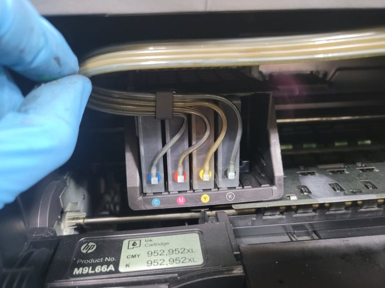● 프린터 헤드 클램프 부착 및 핫멜트 보강, 호스 재정리 장착
