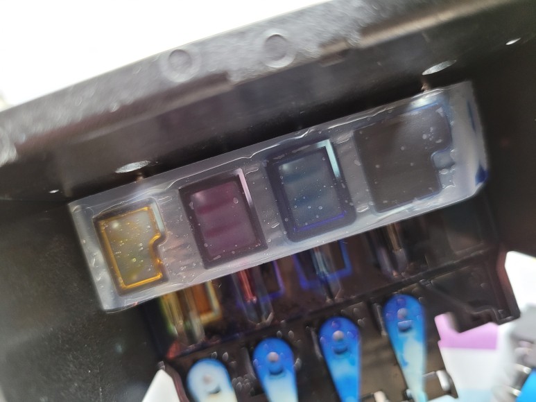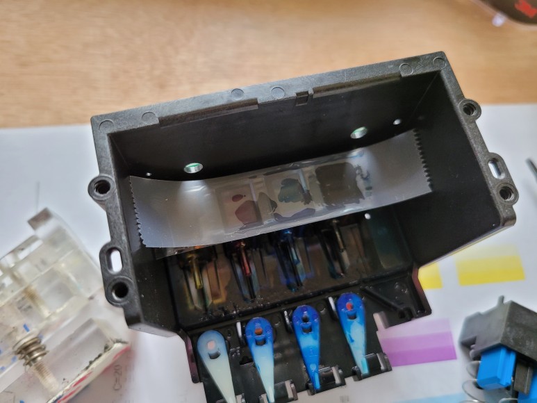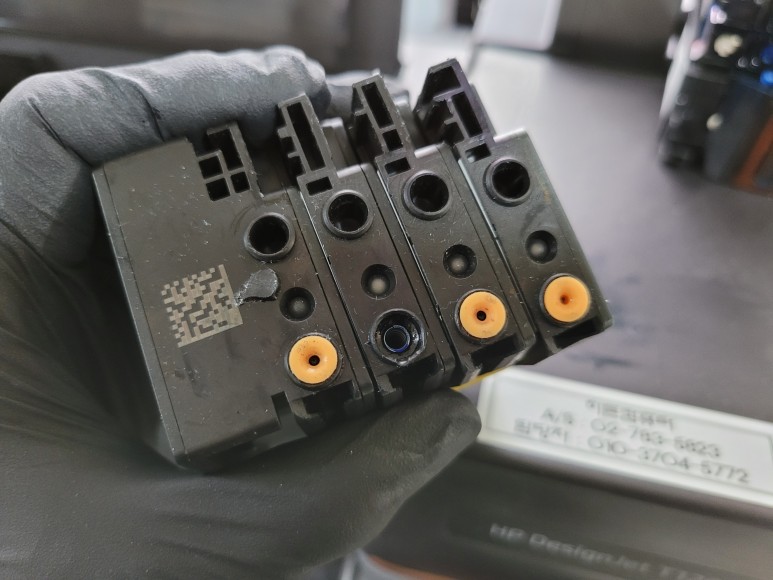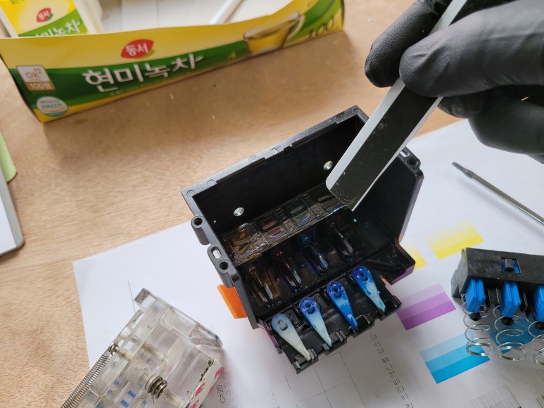 프린터 헤드를 분해해 탄성접착제를 얇게 도포하고 테이핑 보강했습니다. (C 카트리지 부싱 노후화로 파랑으로 오염되어 있었습니다.)