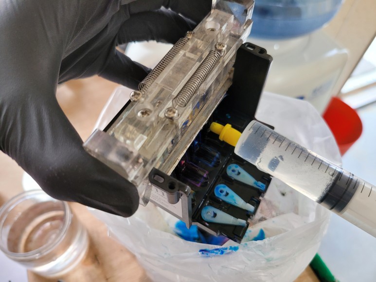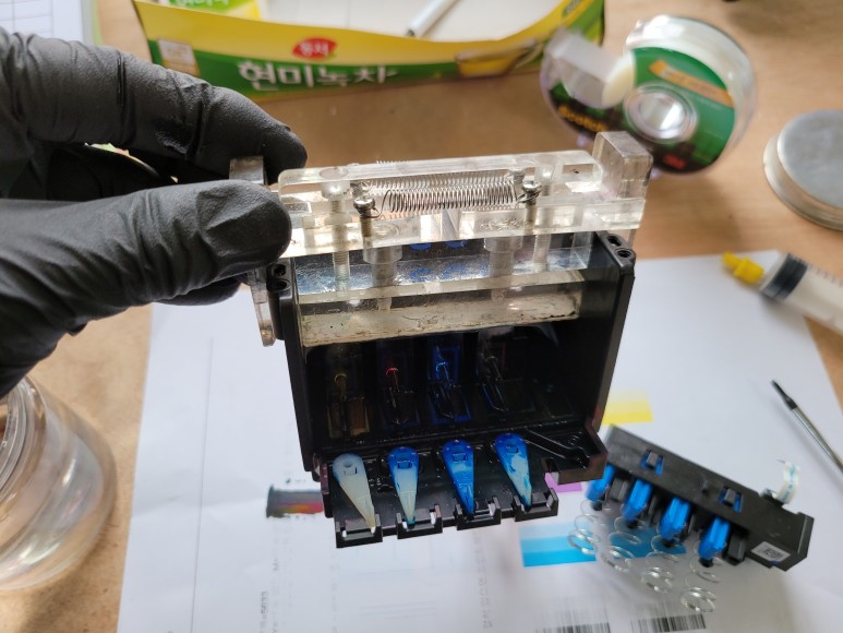 테이핑 마감을 꼼꼼히 하고 챔버 보호 지그를 눌러 양생, 강 세정액을 주입하여 막힌 프린터 노즐을 세척했습니다.