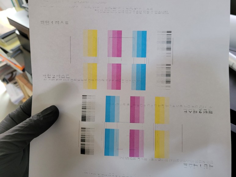 블랙 색상에 전혀 출력되지 않는 상태였습니다. 잉크 빠짐 및 카트리지 내부 잉크 소모됨이 아닌 프린터 헤드 노즐 막힘 증상이었습니다.