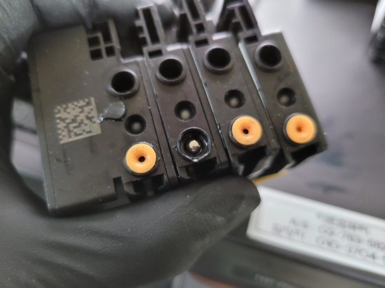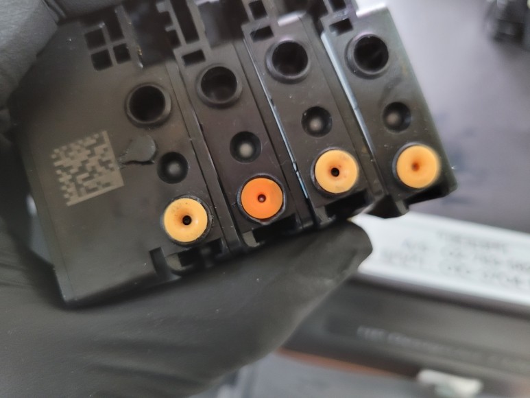 파랑색 부싱이 노후화 되어 손상되어 있었습니다. 파란색 부싱에서 잉크가 새어 프린터 헤드 내부를 오염시켰습니다. 새로운 스텐강구와 부싱으로 교체 했습니다.