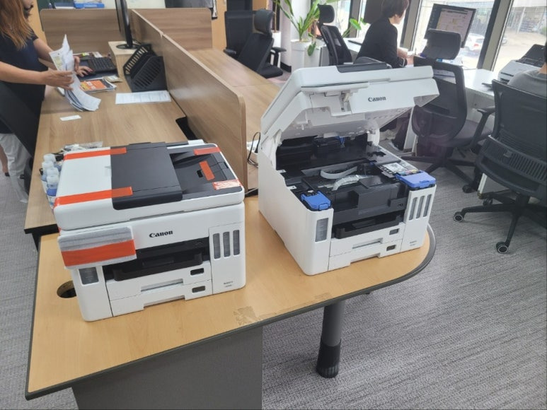 최근 사설 HP 개조 무한잉크에 비해 내구성이 2~3배 강하고, 관리도 편하고, 호환잉크 1리터 보충도 가능하여 학교 학원 어린이집 보험사 부동산 약국 등등 핫하게 뜨는 캐논 GX시리즈 무한잉크 입니다.
