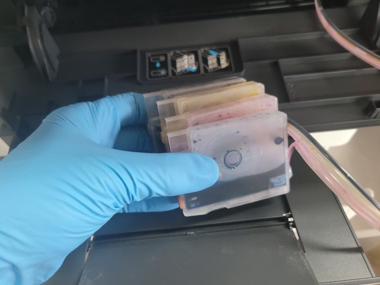 출력불량 및 잉크 카트리지 문제로 빠른 전체 점검 필요 이유 : 1. 호스 내 잉크 경화로 잉크공급 不 2. 카트리지 부싱 및 패킹 노후로 공기유입으로 잉크공급 不 3. 헤드 內 잉크공간 챔버 터짐 (칩판부 슈팅에어라인 비닐탈락, PCB 오염) 4. 스테이션 펌핑모터 불량으로 인한 잉크공급 不