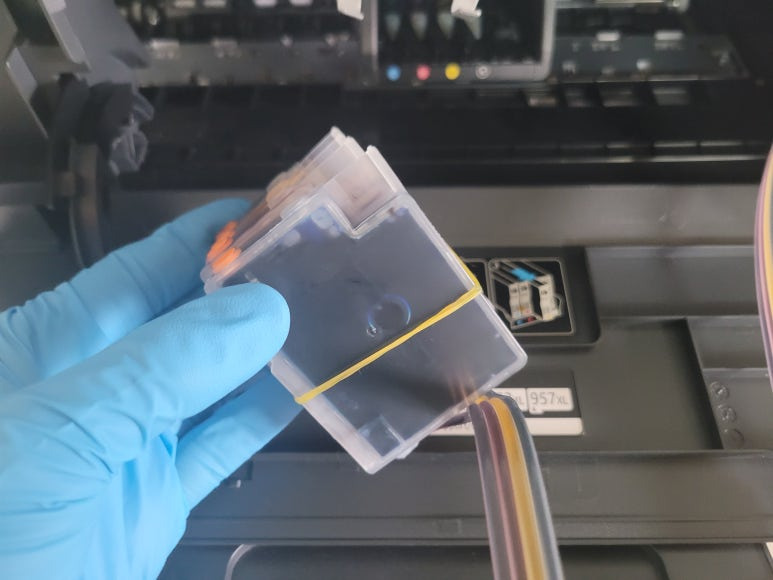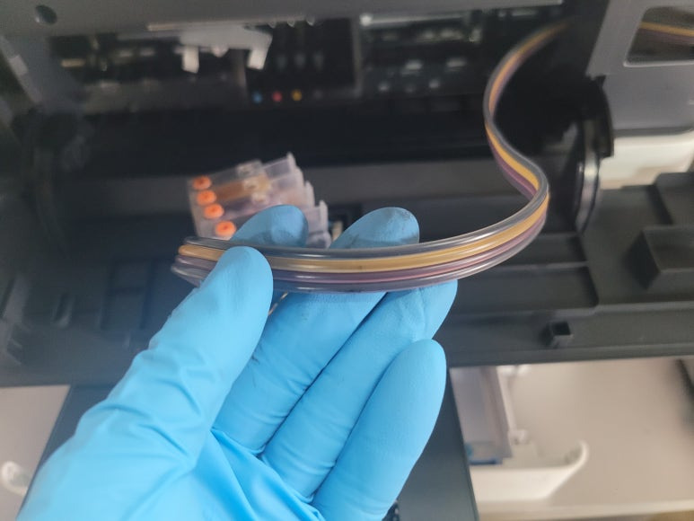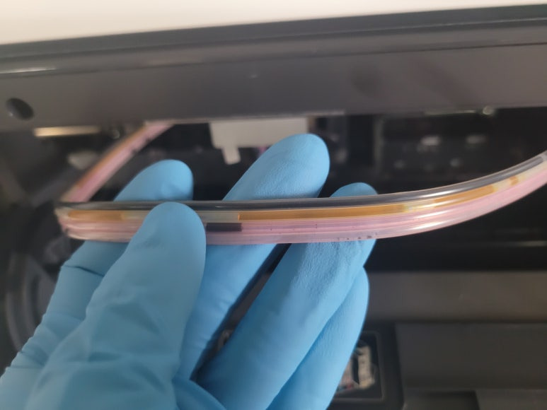 ● 프린터 헤드 클램프 부착 및 핫멜트 보강, 호스 재정리 장착
