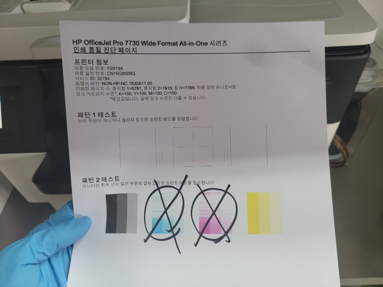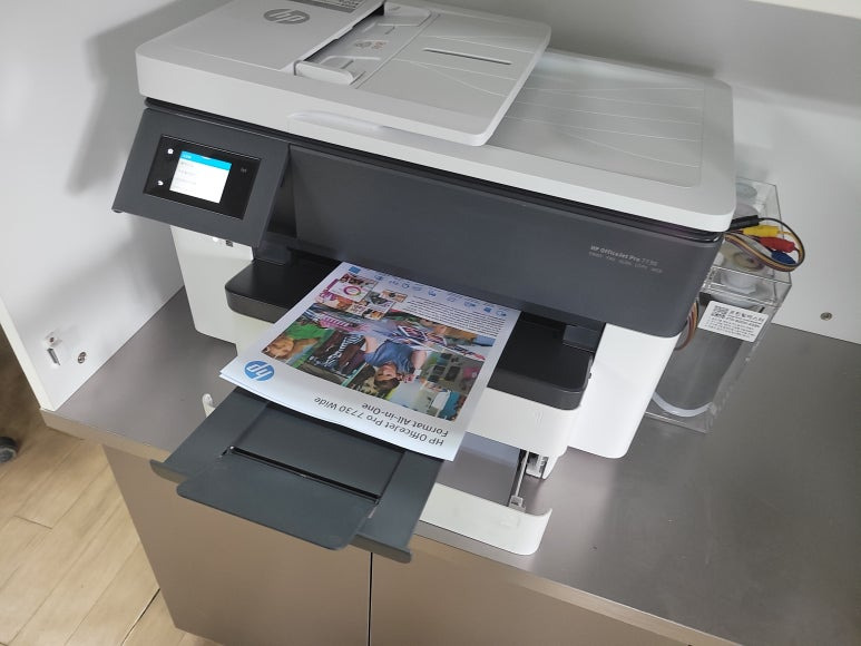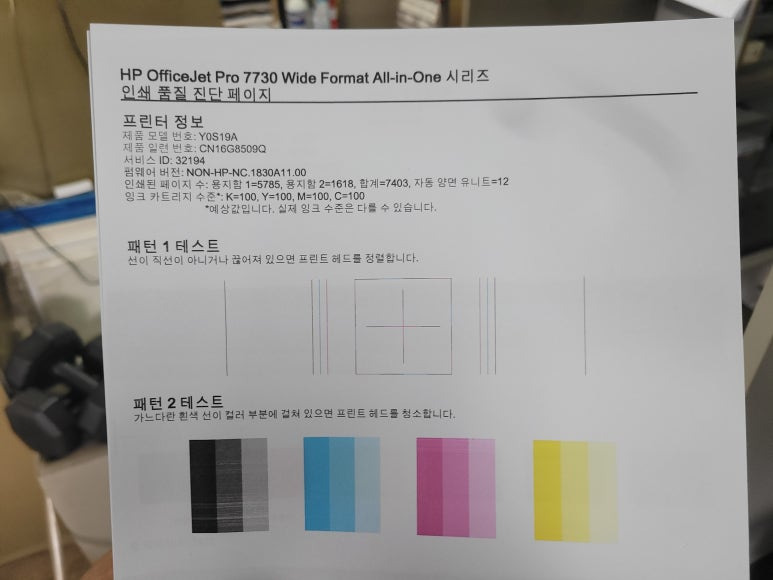 경기 용인시 모현읍 갈담리 소재 가구 관련 사무실에서 A3 도면출력, 스캔, 복사, 팩스 및 문서 출력용으로 사용중인 HP 오피스젯 프로 7730 무한잉크 팩스복합기인데 출력불량 문제로 출장수리 요청하여 스케줄 잡아 이동, 출장수리 완료했습니다.