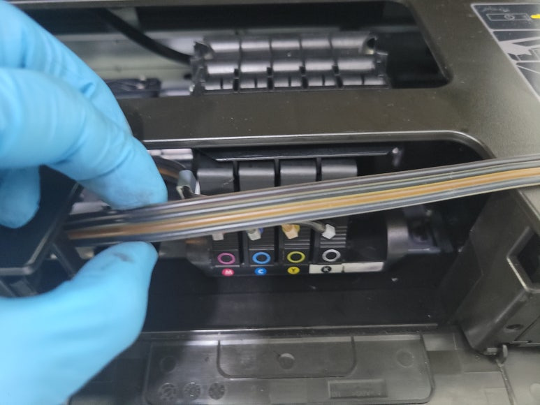 출력불량 및 잉크 카트리지 문제로 빠른 전체 점검 필요 이유 : 1. 호스 내 잉크 경화로 잉크공급 不 2. 카트리지 부싱 및 패킹 노후로 공기유입으로 잉크공급 不 3. 헤드 內 잉크공간 챔버 터짐 (칩판부 슈팅에어라인 비닐탈락, PCB 오염) 4. 스테이션 펌핑모터 불량으로 인한 잉크공급 不