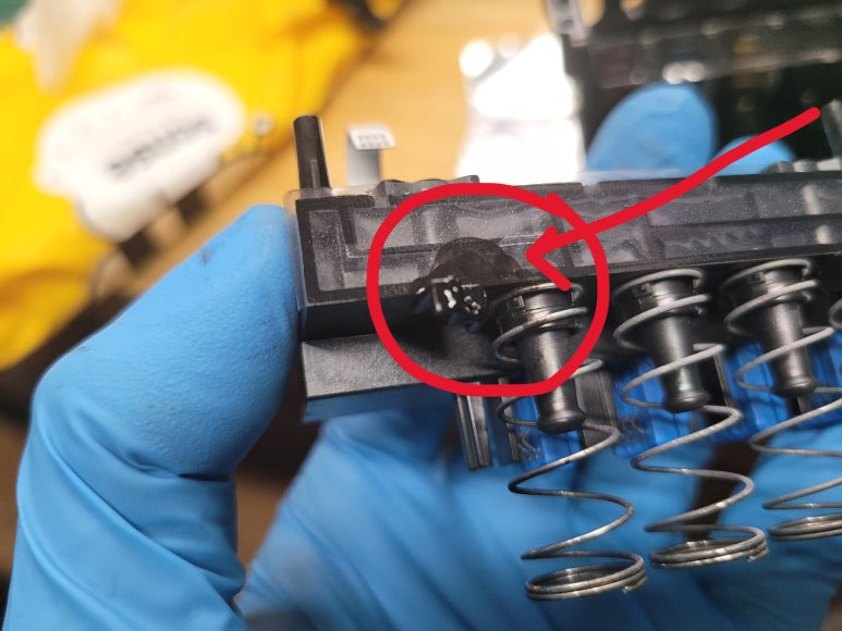 출력불량 및 잉크 카트리지 문제로 빠른 전체 점검 필요 이유 : 1. 호스 내 잉크 경화로 잉크공급 不 2. 카트리지 부싱 및 패킹 노후로 공기유입으로 잉크공급 不 3. 헤드 內 잉크공간 챔버 터짐 (칩판부 슈팅에어라인 비닐탈락, PCB 오염) 4. 스테이션 펌핑모터 불량으로 인한 잉크공급 不