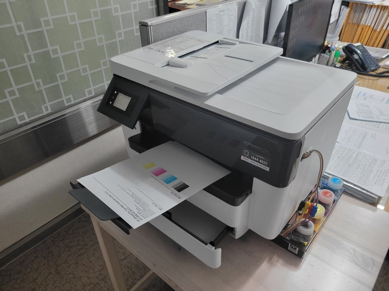 서울 양천구 소재, 무역물류 세관관련 사무실에서 스캔, 복사, 팩스 및 문서출력용으로 사용중인 HP 오피스젯 프로 7740 무한잉크 팩스복합기인데 소모품 시스템 문제로 출장수리 요청하여 스케줄 잡아 이동, 출장수리 완료했습니다.
