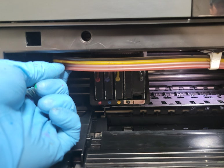 출력불량 및 잉크 카트리지 문제로 빠른 전체 점검 필요 이유 : 1. 호스 내 잉크 경화로 잉크공급 不 2. 카트리지 부싱 및 패킹 노후로 공기유입으로 잉크공급 不 3. 헤드 內 잉크공간 챔버 터짐 (칩판부 슈팅에어라인 비닐탈락, PCB 오염) 4. 스테이션 펌핑모터 불량으로 인한 잉크공급 不