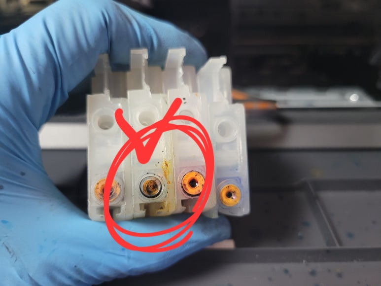 출력불량 및 잉크 카트리지 문제로 빠른 전체 점검 필요 이유 : 1. 호스 내 잉크 경화로 잉크공급 不 2. 카트리지 부싱 및 패킹 노후로 공기유입으로 잉크공급 不 3. 헤드 內 잉크공간 챔버 터짐 (칩판부 슈팅에어라인 비닐탈락, PCB 오염) 4. 스테이션 펌핑모터 불량으로 인한 잉크공급 不