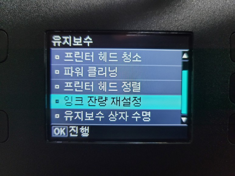 프린터 액정의 메인화면의 설정에 들어가면 유지 보수 메뉴가 있고 항목에 잉크 충전 후에 잉크 잔량 재설정이 있고 유지보수 상자 수명을 확인 할 수 있는 항목, 메뉴가 있습니다.