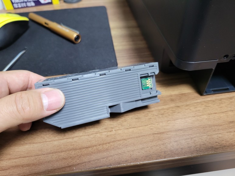 유지보수상자에 인식칩이 부착되어 있습니다. 리셋을 하여 사용하기도 하지만, 폐잉크를 비우지 않고 리셋만 하고 장착시에 잉크가 넘쳐 프린터 내부로 들어가서 오염시키기 되면 프린터가 망가지는 경우도 흔하게 있어 유지보수상자(Maintenance Box)에 잉크가 차면 교체해줘야 합니다.