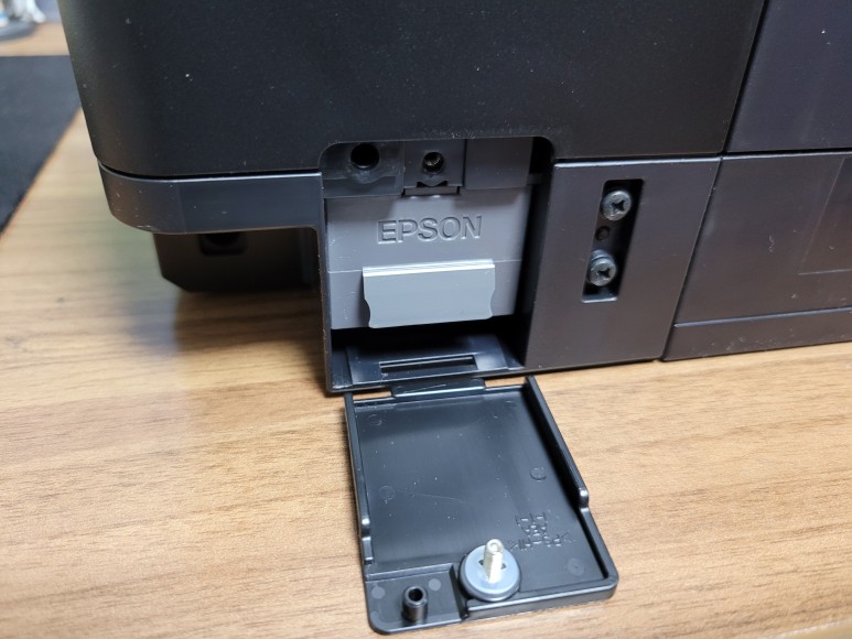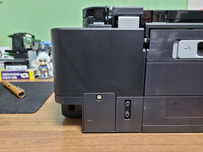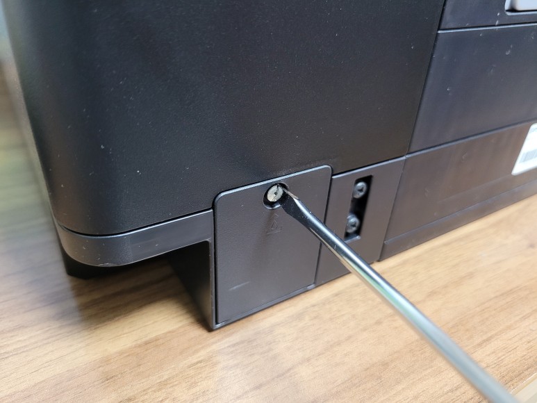 유지보수박스 유지보수 상자의 사용 수명이 종료되었습니다. 교체해야 합니다. 라는 메시지가 나오면 프린터 후면으로 돌리면 후면 왼쪽편에 나사 하나를 풀 수 있는 커버가 보입니다.