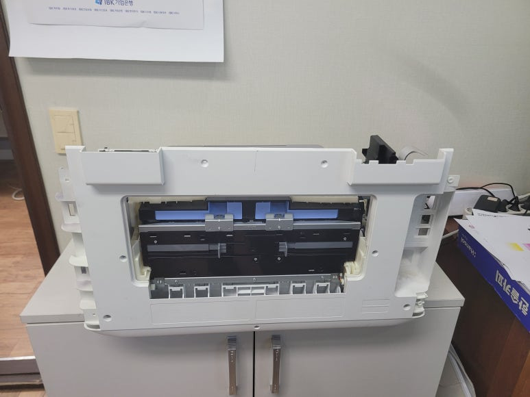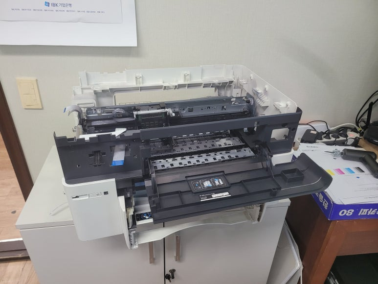 건축건설 인테리어 관련 사무실에서 A3 도면 출력용 및 스캔 복사 팩스용으로 사용하는 HP Officejet Pro 7740 팩스복합기팩스복합기 무한잉크가 내부 노후 및 오염되어 내부 급지부 기어뭉치 노후 및 소음, 용지걸림 없이 용지걸림 증상이 일어나 새장비로 하부갈이 요청하여 스케줄 잡아 출장수리 완료했습니다.