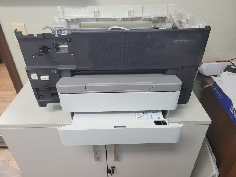 HP HP Officejet Pro 7740 팩스복합기를 새장비로 탈바뀜 할 수 있는 방법은 물빨래하여 부품 하나하나 교체하는 비용 보다 하부 전체를 새장비로 교체하는 방법이 있습니다. 당연 하부 전체를 새장비를 교체하는 방법이 저렴합니다. HP 7740 팩스복합기 기존 헤드 및 메인보드, 스캔부(ADF), 카트리지 와 무한잉크 공급장치를 그대로 사용하고 문제되는 오염된 내부 전체를 새장비로 교체합니다. 여기에 추가로 헤드까지 교체하다면 거의 새제품에 가깝게 됩니다.