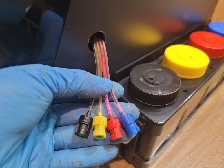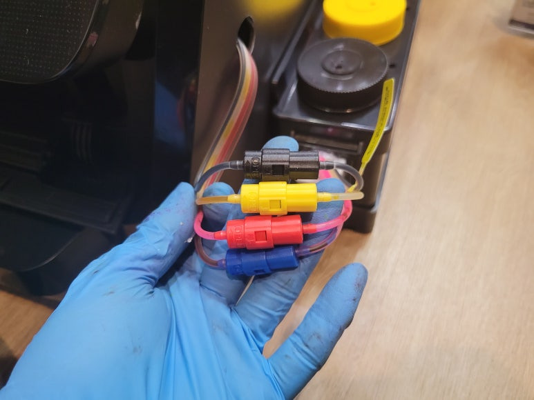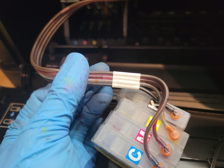 ● 프린터 헤드 클램프 부착 및 핫멜트 보강, 호스 재정리 장착