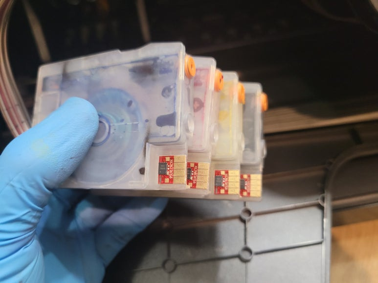 출력불량 및 잉크 카트리지 문제로 빠른 전체 점검 필요 이유 : 1. 호스 내 잉크 경화로 잉크공급 不 2. 카트리지 부싱 및 패킹 노후로 공기유입으로 잉크공급 不 3. 헤드 內 잉크공간 챔버 터짐 (칩판부 슈팅에어라인 비닐탈락, PCB 오염) 4. 스테이션 펌핑모터 불량으로 인한 잉크공급 不