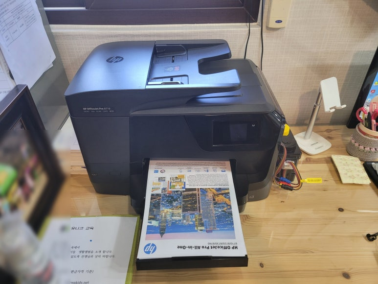 경남 산청군 소재, 어린이집 사무실에서 스캔, 복사, 팩스 및 문서출력용으로 사용중인 HP 오피스젯 프로 8710 무한잉크 팩스복합기인데 소모품 시스템 문제로 출장수리 요청하여 스케줄 잡아 이동, 출장수리 완료했습니다.