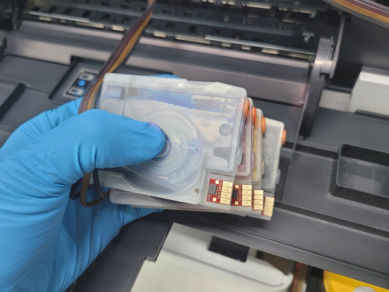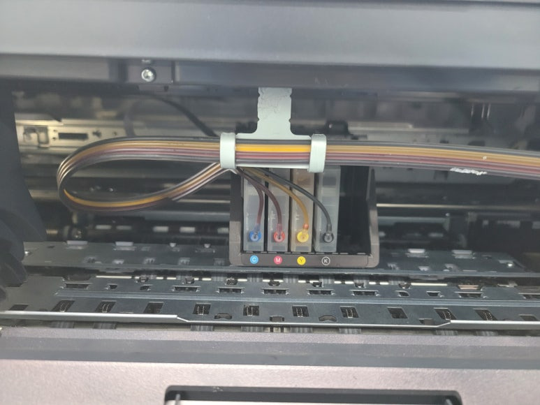 프린터헤드는 열분사 방식으로 잉크가 빠진 상태에서 사용시 헤드 노즐이 타서 망가집니다. 색빠짐 및 출력불량시 사용을 자재해야 합니다. (즉시 수리 필요)