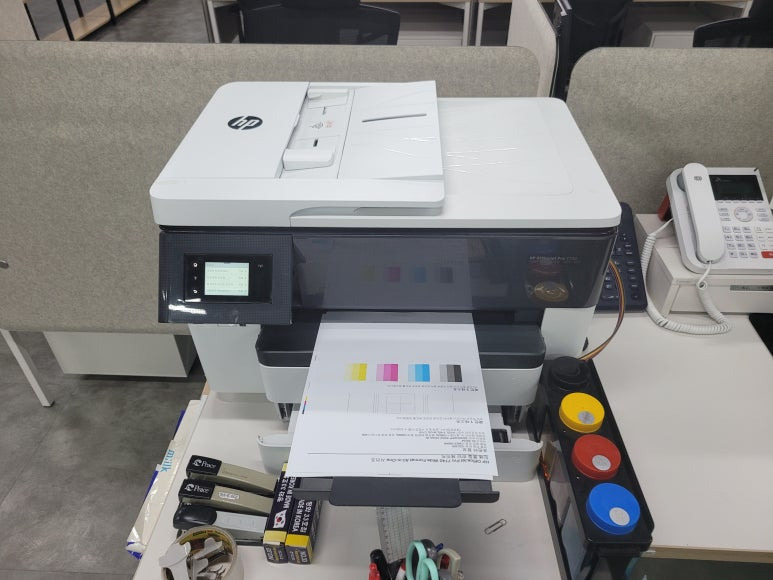 서울시 송파구 소재, 사무실에서 스캔, 복사, 팩스 및 문서출력용으로 사용중인 HP 오피스젯 프로 7740 무한잉크 팩스복합기인데 특정색상 색빠짐 출력불량로 출장수리 요청하여 스케줄 잡아 이동, 출장수리 완료했습니다.