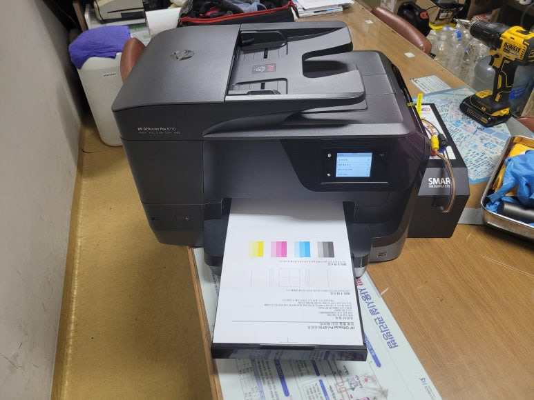 서울 양천구 소재, 사무실에서 스캔, 복사, 팩스 및 문서출력용으로 사용중인 HP 오피스젯 프로 8710 무한잉크 팩스복합기인데 특정색상 색빠짐 출력불량로 출장수리 요청하여 스케줄 잡아 이동, 출장수리 완료했습니다.