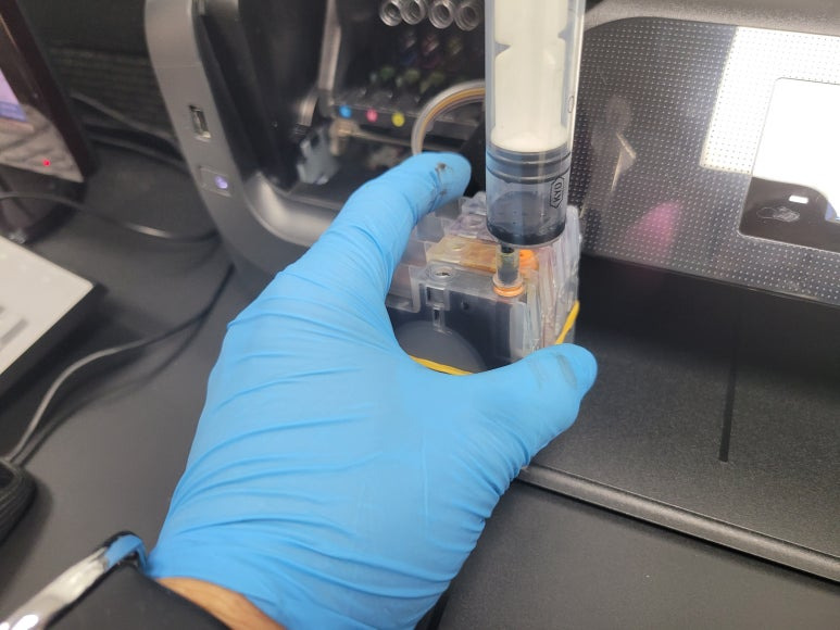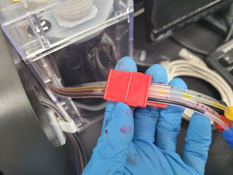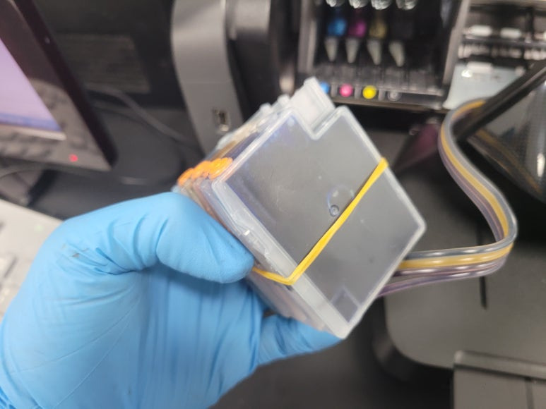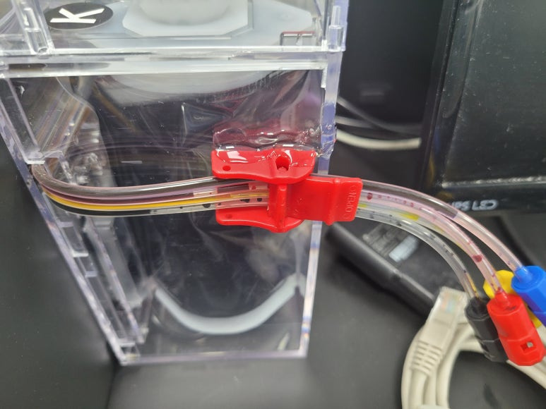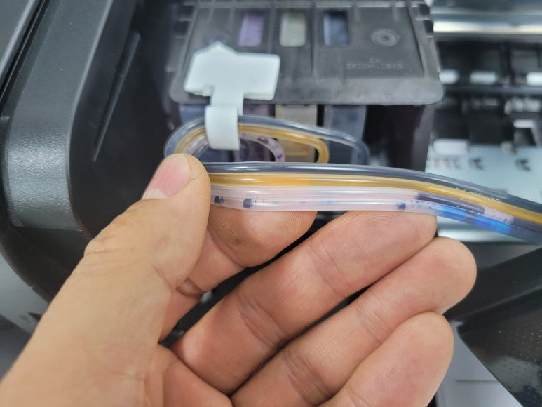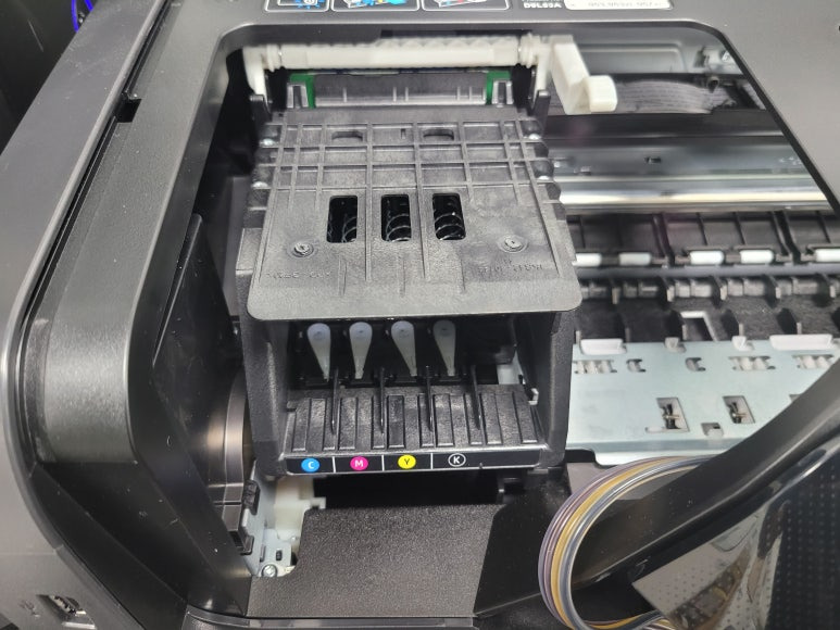 프린트헤드 신규 교체 및 카트리지 석션 잉크 차징, 호스재정리 수리 완료했습니다.