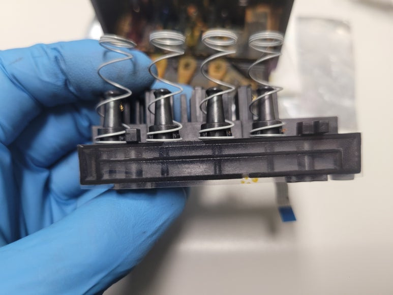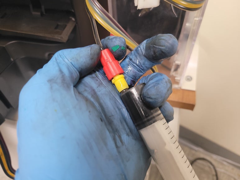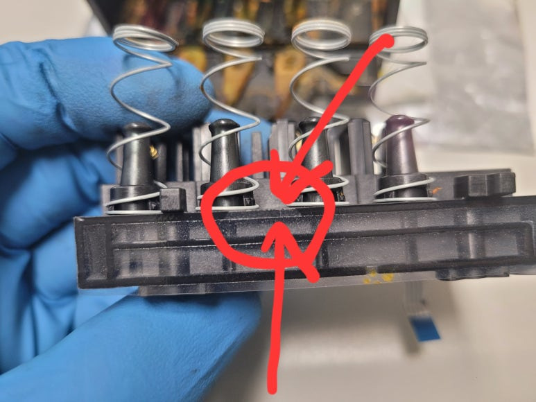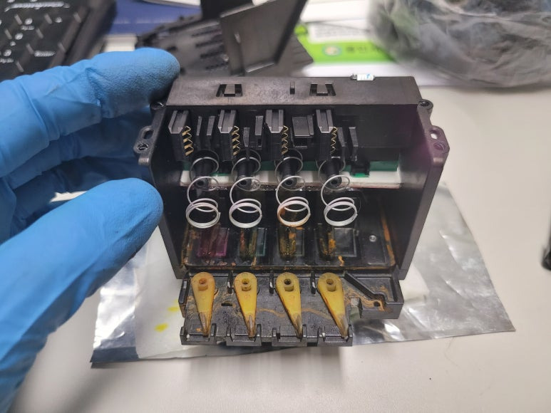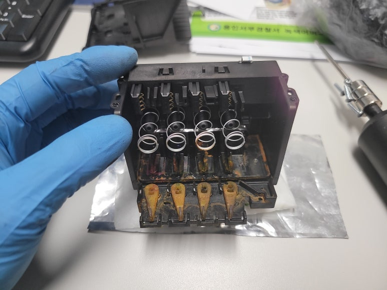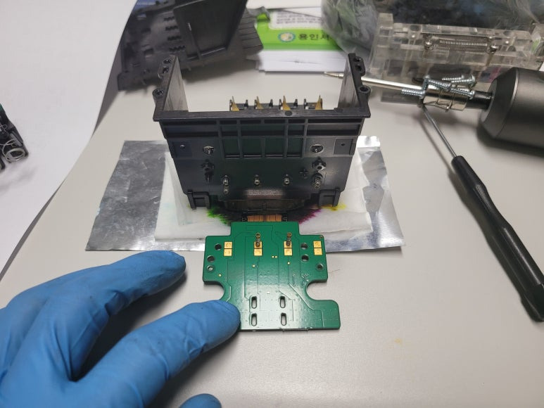 잉크공급라인 잉크경화 세정 ➞ 공급기 자체 불량 교체 ➞카트리지 석션 및 잉크 차징 ➞ 프린트헤드 분해 ➞ 헤드 칩판부 비닐탈락 수리 ➞ 헤드 챔버 보강 수리 ➞ 헤드 PCB 납땜쇼팅 ➞ 노즐점거 및 출력테스트