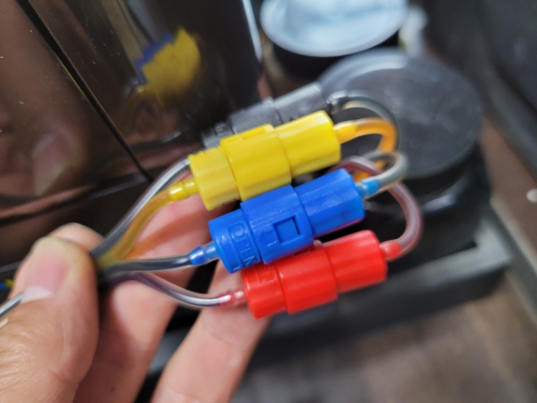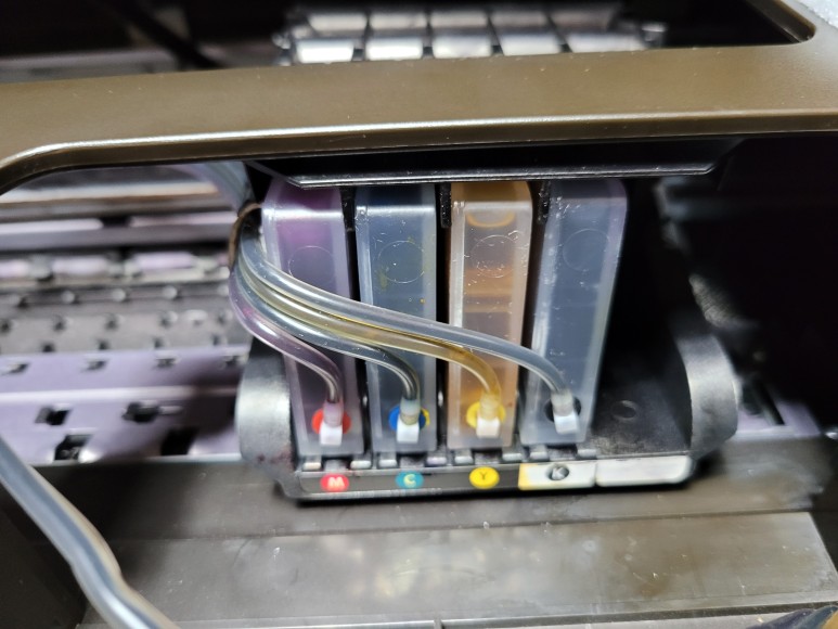 <잉크 카트리지 소모됨 . 인쇄를 다시 시작하려면 다 쓴 카트리지를 교체애햐 합니다.> 문제로 출력이 안되는 상태였습니다. 잉크 카트리지 내부에 잉크가 소모되고 호스 내부에 잉크가 빠지면서 원활한 잉크 공급이 안 되고 있었습니다.