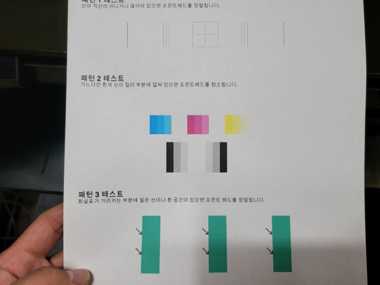 헤드 노즐 점검 위해 인새 품질 진단 페이지를 출력하여 확인했습니다.