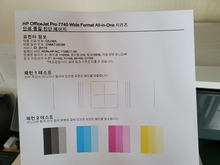헤드 노즐 점검을 위해 인쇄 품질 진단 페이지를 출력했습니다. 노즐이 막혀 흰색 선이 일부 색상에 걸쳐 있었습니다.