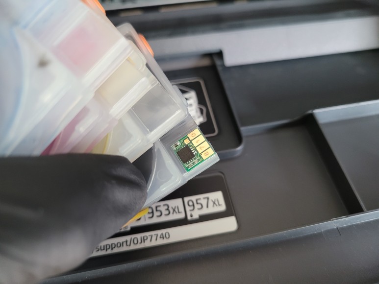 위와 같은 메세지는 7740 무한잉크를 온라인으로 구매하신 분들에서 많이 나타납니다. 카트리지를 빼보면 중국산 4칩으로 되어 있습니다. 온라인 판매제품은 낮은 가격으로 노출하기 위해 저렴한 시스템을 사용한 경우 자주 나타납니다. 카트리지 소모됨으로 초기화 작업을 하면 사용량이 별로 없어도 잦은 펌핑으로 스테이션에 잉크가 넘쳐 흐르기도 합니다. 자동 펌업데이트로 칩을 새로 교체해야 하는 경우도 자주 발생합니다.