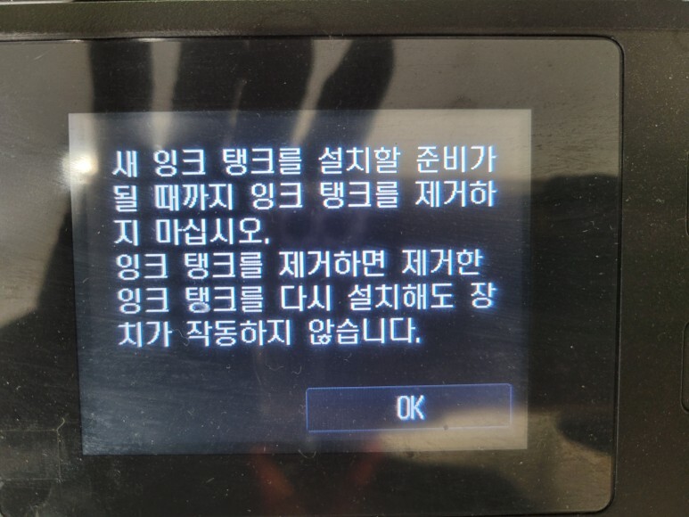 서울 성북구에 위치한 아파트 관리사무실에서 온라인에서 구매하여 사용하는 캐논 맥시파이 MB5120 무한잉크에서 새 잉크 탱크를 설치할 준비가 될 때까지 잉크 탱크를 제거하지 마십시오. 라는 문구로 멈춰 출장수리 요청하여 스케줄 잡아 이동, 출장수리 완료했습니다.