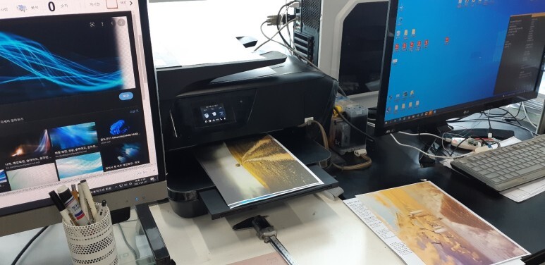 헤드 노즐 점검을 위해 인쇄품질진단페이지를 출력해 확인했습니다.