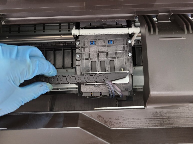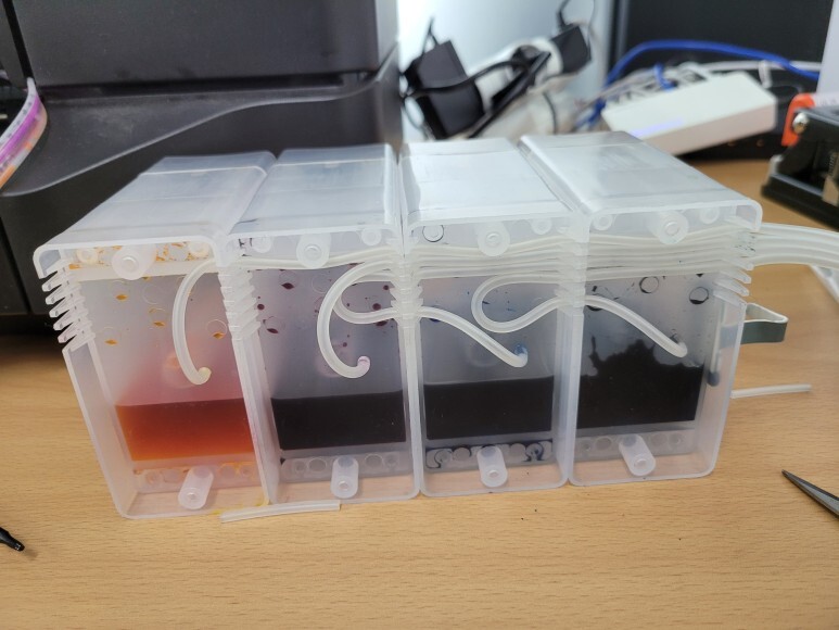 공급기 호스 내부에 잉크가 빠지고 심하게 굳어 경화현상으로 전혀 잉크가 카트리지로 공급되지 않는 상태였습니다. 너무 심하게 잉크가 굳어 호스를 신규 교체해야 했습니다.