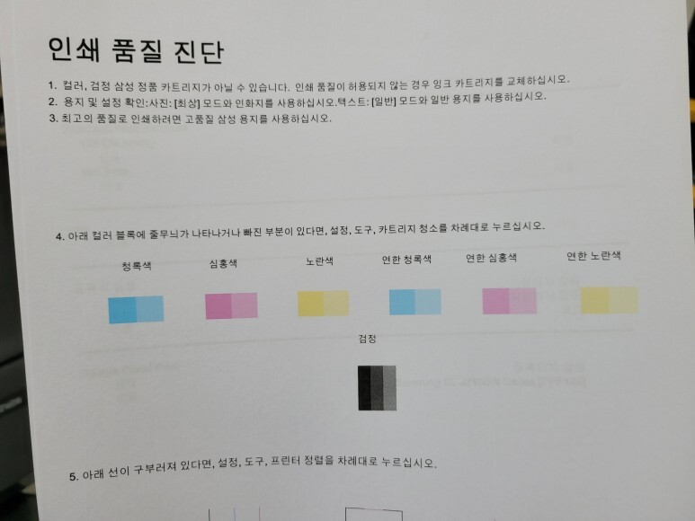 도구의 인쇄 품질 보고서를 출력하여 카트리지 노즐 점검을 하였습니다.