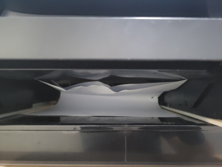 후면 듀플렉스 쪽에 피아노 현상으로 용지가 구겨져 있었습니다. 부채처럼 접혀 있는 걸 피아노 현상이라고 합니다. 파지 없이 후면에서 아주 살살 제거했습니다. 모든 용지는 전면으로 제거시 프린터 고장으로 이어집니다. 항상 후면에서 뒤로 빼내야 합니다.