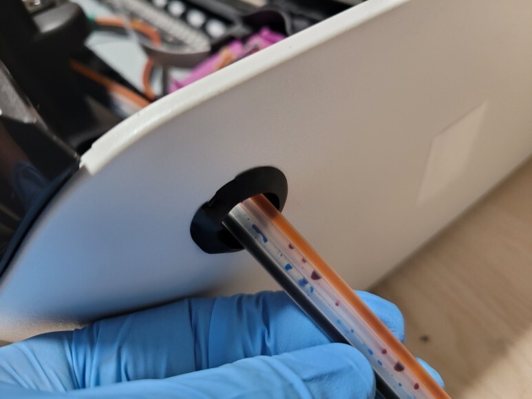카트리지 장착 후에 클램프를 부착하고 핫멜트로 단단히 고정하여 호스를 정리하였씁니다.