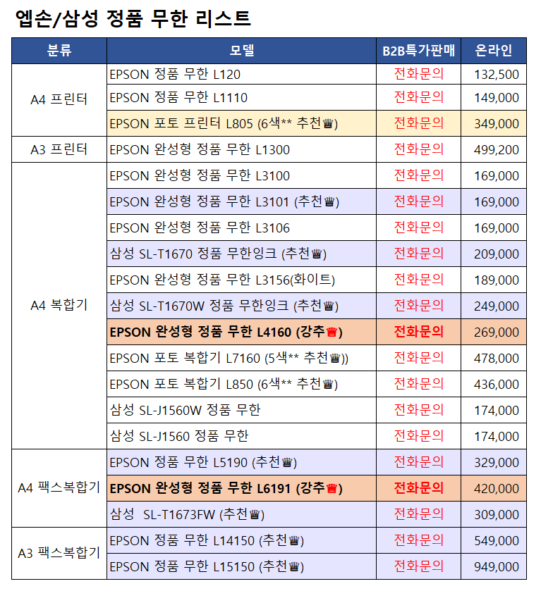 30~50만원대 오피스군으로 HP 및 엡손 사설***무한 사용을 권장합니다.
